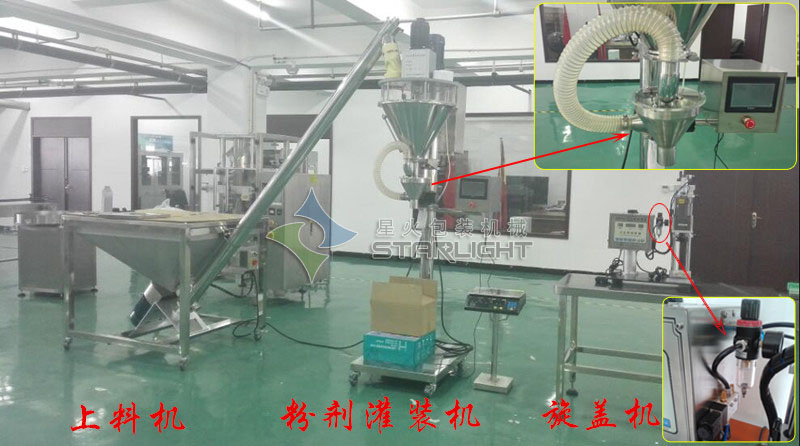 消防粉灌裝生產(chǎn)線/全自動粉末灌裝生產(chǎn)線前部分工序設備:上料-粉劑灌裝-旋蓋