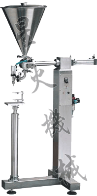 原理及特點, 該灌裝機容量為50g, 使用時旋轉容量調節鈕,觀看刻度表。指針對準你所需灌裝的容量,然后扳動手柄試灌裝。 |